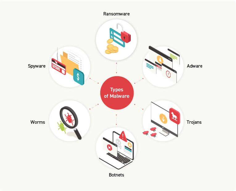 Each type of malware has its own specific characteristics and methods of attack, such as spyware, worms, Trojans, and botnets. These terms are defined below.